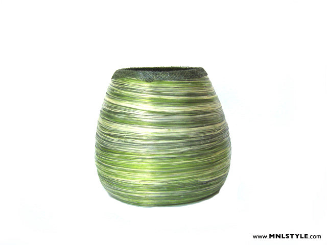 Sinamay threads molded perfectly into a chic pot. Perfect for displaying plants or other household decoratives. Also a good place to keep your kitchen utensils! Green sinamay with or without a plastic inner lining [Base: 5.75”, Opening: 4”, Height: 6”].