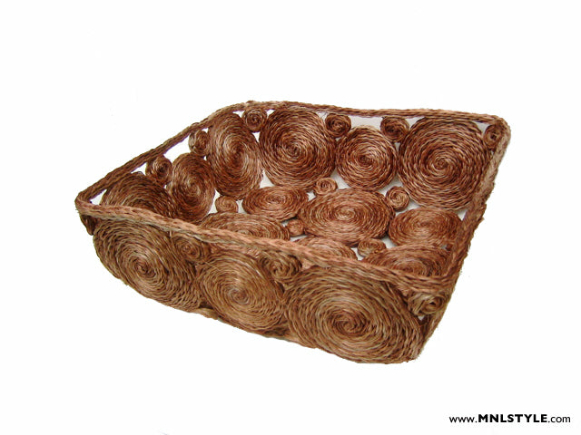 A fun accent to your dining or coffee table. Let your mind be absorbed by the spiraling circles. You can add other decorative pieces but we think the circles are pretty on their own. A great housewarming present! In light brown. Abaca [Small: 10” x 10” x 3.5”, Large: 12” x 12” x 4”].