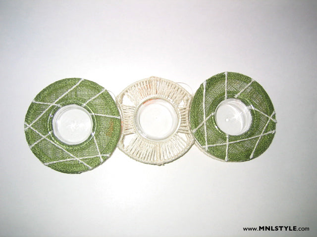 These tea light candle holders fit like puzzle pieces. Or, you can go dramatic and separate each piece from each other. Sinamay threads create perfect frames for tea light candles. In green/natural and brown sinamay[4”diam x 1”high].