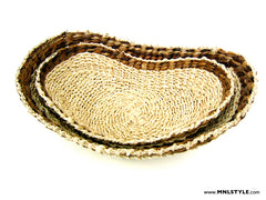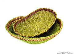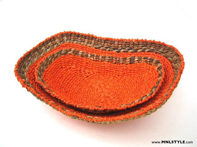 Rustic Filipino with a stylishly handcrafted fare. Crafted from the Abaca plant, a quickly growing (and highly renewable) plant from the Philippines. Also known as Manila Hemp, often used to make strong rope. Nesting set of two. In olive, natural, or orange. [12.5” x 9” x 4”]