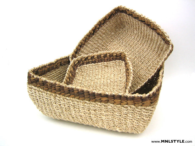 Rustic Filipino yet stylishly functional for your home. Two nesting baskets to use decoratively or to use separately for serving food. Use this amazingly sturdy woven abaca fiber to decorate your home. Nesting set of 2. In natural only. [Small: 7” x 2”, Medium: 9” x 3”].