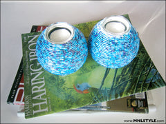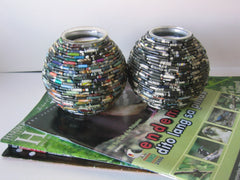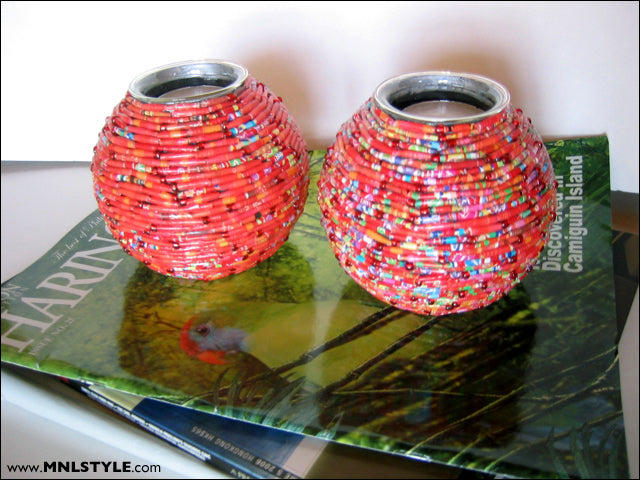 These tea light balls will not only add just the right touch of light and style to your room, they will satisfy your need to make a difference. Using tightly wound pages from used magazines, these accents reduce waste and are handcrafted by an associated group of the Filipinas Fair Trade Venture Group. Magazine pages are tightly wound and create decorative balls to hold your tea light candles. Set of two. In red, white, black, or blue.