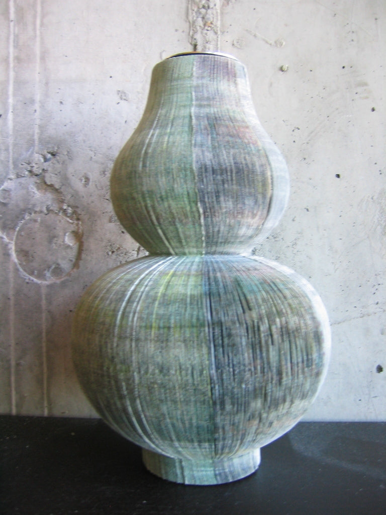 Go ahead and rub this belly. Crafted out of recycled newspaper, this is more than just a vase…it reduces waste. Smooth curves and voluptuous style. A metal insert on the top allows you to display whatever you please.