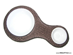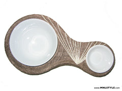 Compact and stylish, this is ideal for serving little bites and sauces for your next party. Or – use it as a cereal bowl with a little dish for dried fruit or nuts! Have too much stuff for yourself? Your little feline friend could use a new dish as well. Bowl and saucer included. In navy blue sinamay, chocolate sinamay, or chocolate woven twine [12.5”L x 2”H x 6.5” large bowl, 3.75” small bowl].