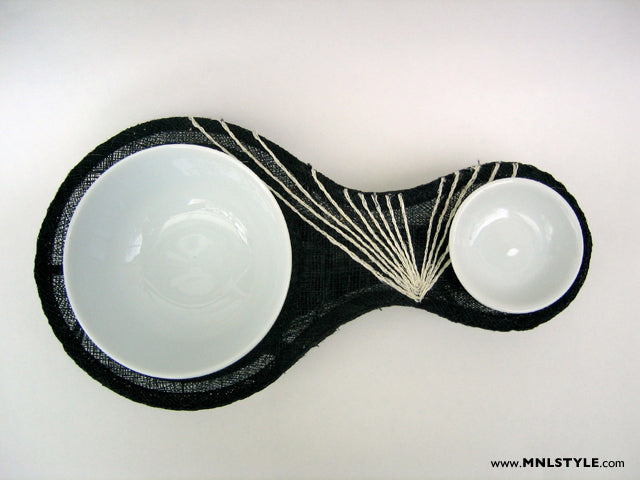 Compact and stylish, this is ideal for serving little bites and sauces for your next party. Or – use it as a cereal bowl with a little dish for dried fruit or nuts! Have too much stuff for yourself? Your little feline friend could use a new dish as well. Bowl and saucer included. In navy blue sinamay, chocolate sinamay, or chocolate woven twine [12.5”L x 2”H x 6.5” large bowl, 3.75” small bowl].