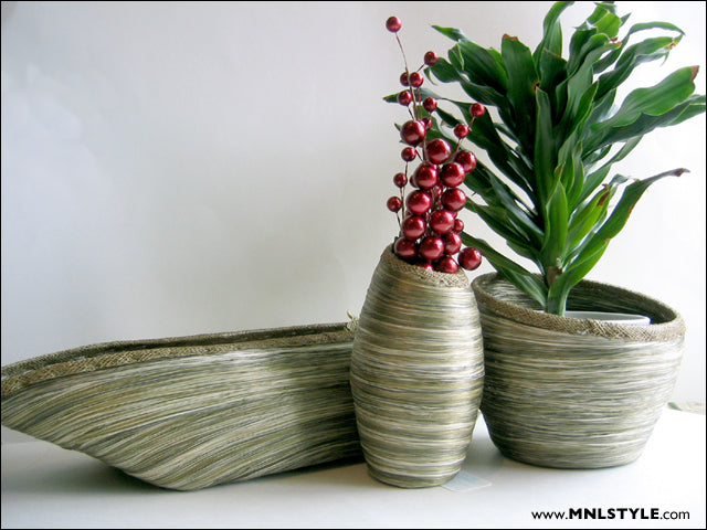 Aah…our most popular houseware piece. Sinamay threads molded perfectly into elegantly organic pieces. This sturdy set is perfect for displaying plants or other household decoratives. Made of quickly renewable fibers from the abaca plant so this set will make you look good and feel good.