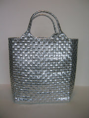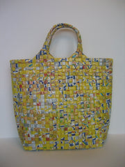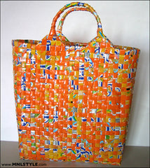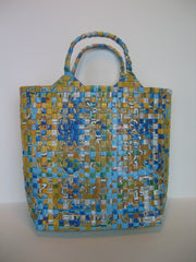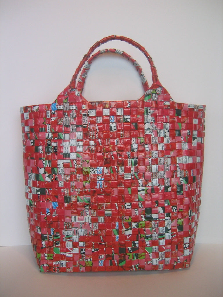 Used and sanitized juice pouches have been woven to create this carry all bag. And we mean carry it all. The weaving has resulted in an incredibly strong bag.